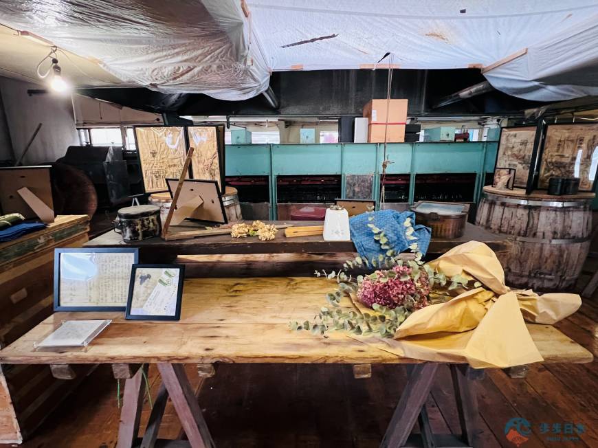 接著,我們到了小田島水產食品的「小型博物館」,以花藝及古道具展示的空間裡,是函館百年鹽辛走過的歷史。他們也曾在 1990 年代考慮放棄須細心維護的木桶,改用更輕便的塑膠桶。然而,當時使用塑膠桶醃製的鹽辛,過了一週竟無法熟成,僅僅是鹽漬魷魚。當時的社長才體會到「果然還是得要用木桶醃製啊!」
