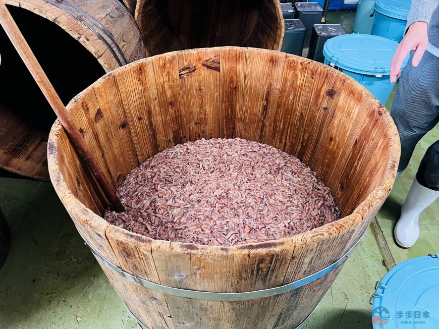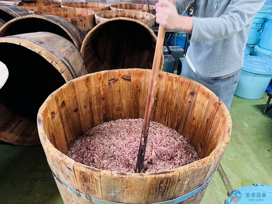 終於見到函館百年釀製鹽辛的木桶本尊了!負責人講解道:「長年使用的木桶中,棲息著發酵菌,我們特別講究,讓鹽辛慢慢地熟成發酵。不同一般鹽辛,在醃製隔天即完成,這裡的鹽辛至少需要醃製約一週的時間才能出貨,因此能做出色澤清透,帶有柔和風味的櫻花色鹽辛。」
