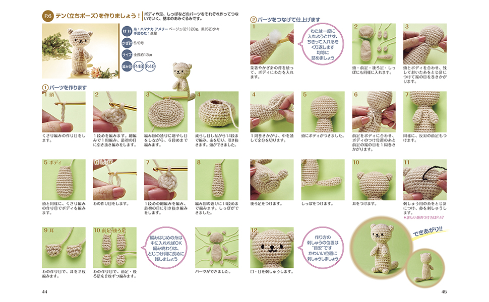 這本書的書名是《鉤針編織動物玩偶》(かぎ針で編む 動物のあみぐるみ),為想嘗試編織娃娃的讀者提供入門指南,由手作與生活風格作家寺西惠里子撰寫。寺西惠里子過去曾任職於三麗鷗,負責兒童商品設計,之後投入手作創作,出版超過750本與手作、生活與兒童相關的書籍,是日本相當知名的手作作家之一。這本書的誕生與一本繪本計畫密切相關。日本老字號毛線品牌「Hamanaka」的官方角色「貓咪Mana與Yu」曾被製作成繪本,而繪本中的角色玩偶正是由寺西惠里子負責設計與編織。當時有人提出「如果能把繪本角色自己編出來就好了」的想法,於是促成了這本編織書的誕生。讀者不僅能編出可愛玩偶,也能讓故事角色走進日常生活。