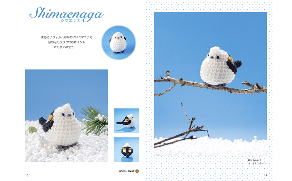 我看到書裡,有教人家怎麼編織在北海道被稱為「雪精靈」的島長尾山雀(シマエナガ),圓滾滾的白色外型真的超可愛!之前去北海道時買過雪精靈的娃娃,現在看到編織書裡的毛線模樣,風格不同,但也是很可愛!