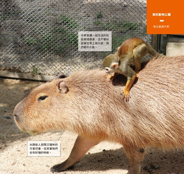 埼玉縣的「東武動物公園」著名的「松鼠猴樂園」,除了多達 26 隻的松鼠猴,還有 3 隻水豚在其中共同生活,因此誕生了「水豚計程車」的名場面。