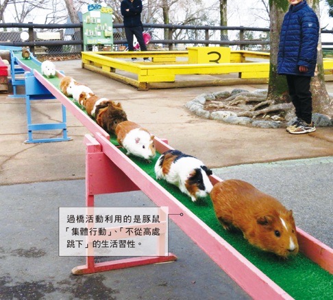 「豚鼠過橋」是「埼玉縣兒童動物自然公園」從 30 幾年前便開始舉辦的例行活動,在親近活動結束之後,豚鼠們便會因「集體行動」、「不從高處躍下」的習性,整齊地列隊返回自己的小屋,每天有三次機會能瞧見這樣的可愛光景喔!
