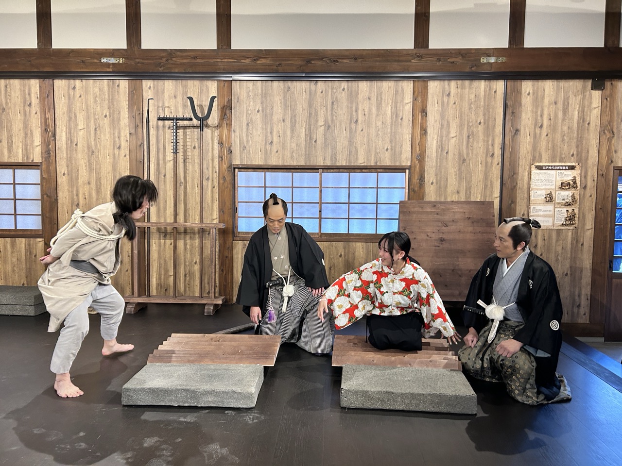 這是一個可以模擬體驗江戶時代拷問的內容,相當大膽的企劃。攝影棚的美術工作人員重現的拷問器具一字排開,你可以實際體驗被施以拷問,據說不會痛。