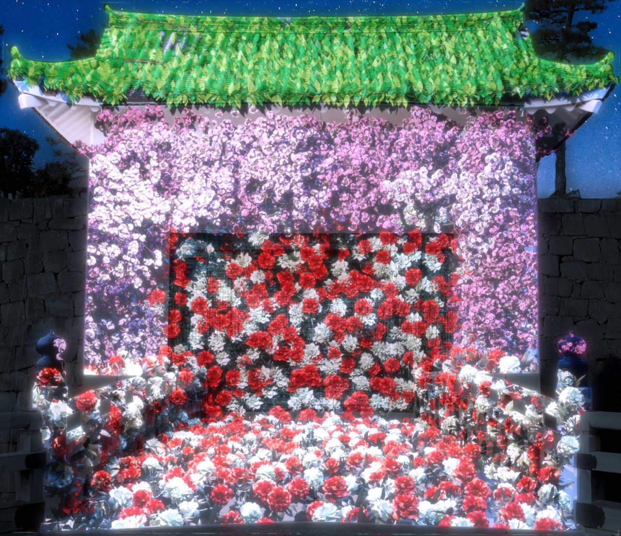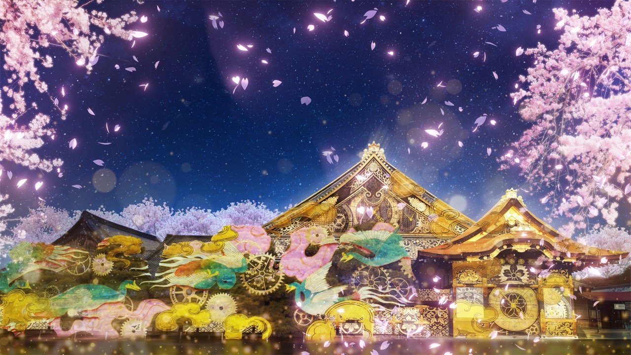 以櫻花花瓣為主題的數位藝術,投射在二之丸御殿、南門前牆面、櫻之園、本丸櫓門、清流園的櫻花並木等城內各個角落。