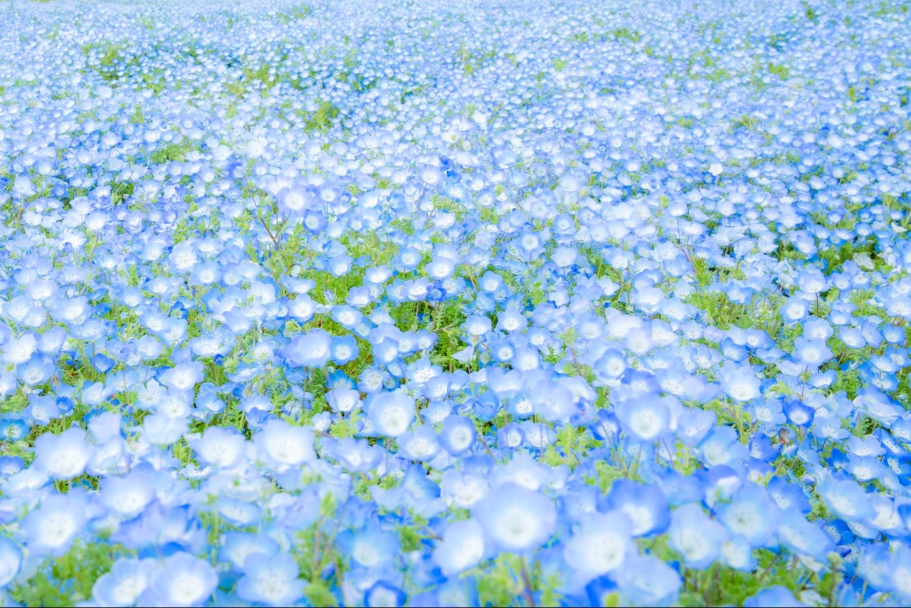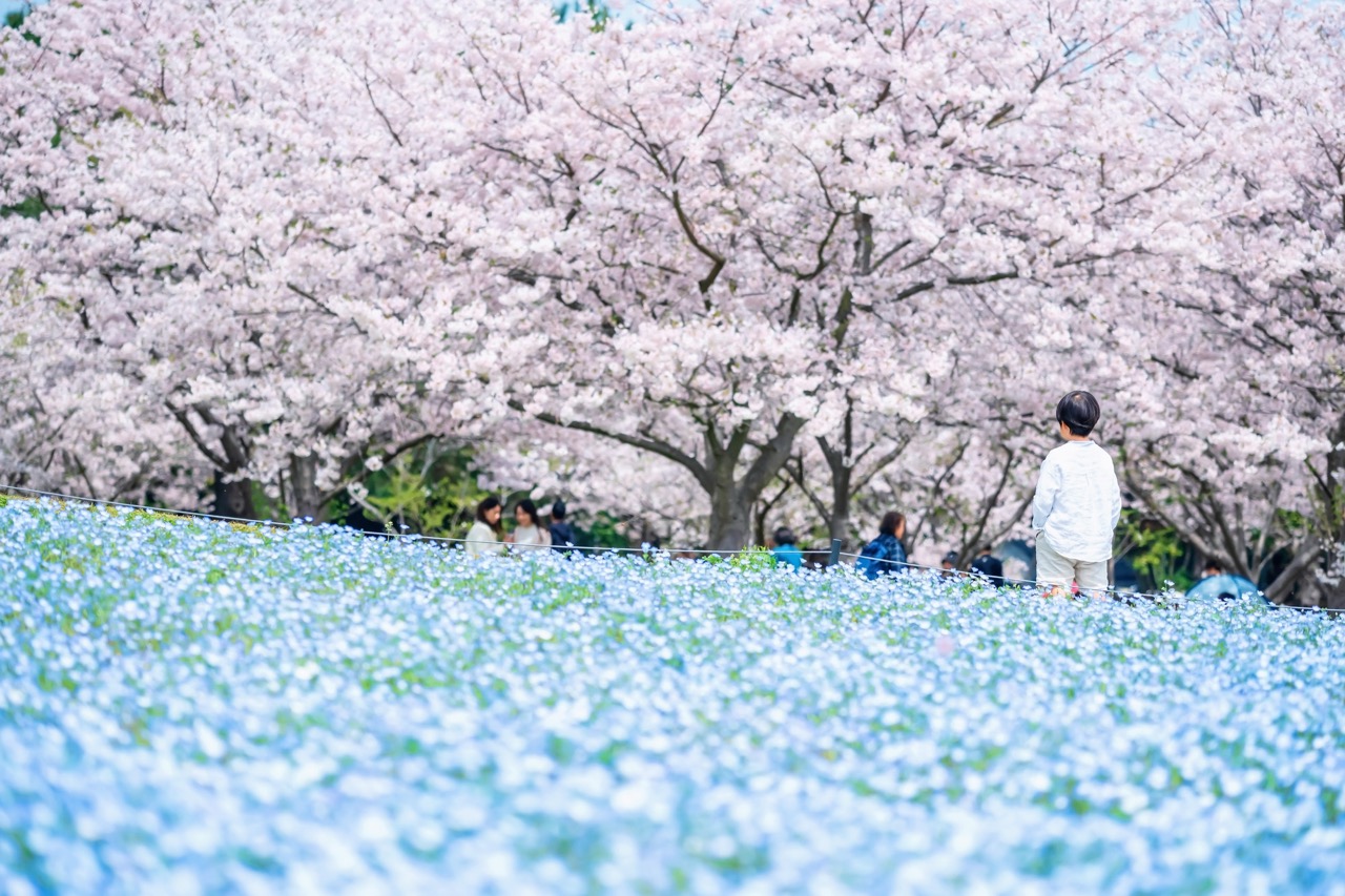 粉蝶花(ネモフィラ)滿開的狀態是拍照效果最好的時期,還有機會同時拍到櫻花與粉蝶花交織的畫面。