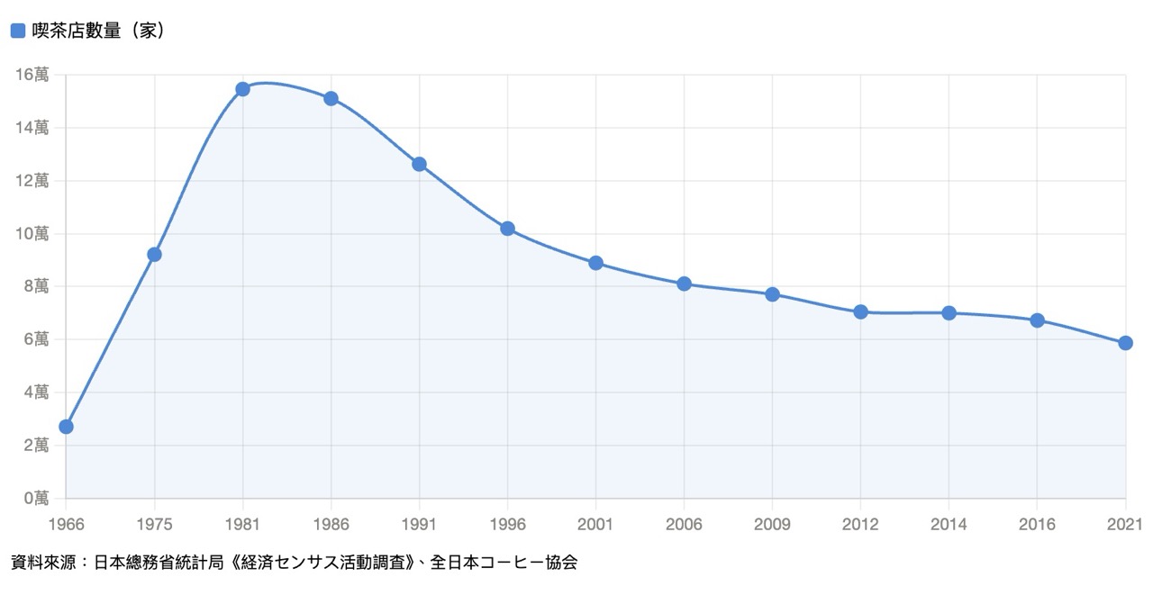 根據日本總務省統計局的調查資料,日本全國喫茶店數量在 1981 年(昭和 56 年)達到 154,630 家的高峰後逐年下滑,全日本咖啡協會(全日本コーヒー協会)的統計,則顯示喫茶店數在 2008 年前後再度出現明顯減少趨勢,2021 年(令和 3 年)已降至 58,669 家,約為 1981 年高峰期的三分之一。這個數字的消長,也是日本戰後社會變遷的縮影。