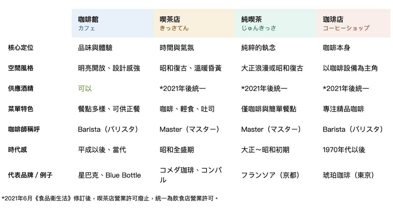 2021 年 6 月法規修訂後,喫茶店營業許可正式廢止,全面併入飲食店營業許可,法律上喫茶店作為獨立業種的分類已不復存在,新規開業一律須申請飲食店營業許可,既有店家也須於更新時完成切換。而珈琲店這個名稱,在法規上從來就不是獨立類別,而是店家用來強調講究咖啡品質的自我定位與品牌聲明。