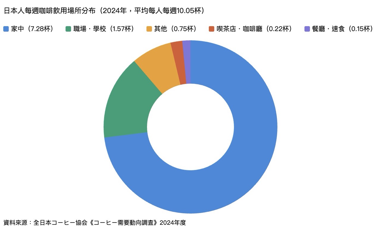 全日本咖啡協會 2024 年的調查數據也顯示,日本人平均每週飲用咖啡約 10.05 杯,其中絕大多數(每週約 7.28 杯)是在家中飲用,在喫茶店或咖啡廳飲用的比例(每週約 0.22 杯)相對偏低。這說明了一件有趣的事,日本的咖啡文化,早已從喫茶店走進了每一個家庭,成為深入日常的生活習慣,而不只是一種出門才有的消費體驗。