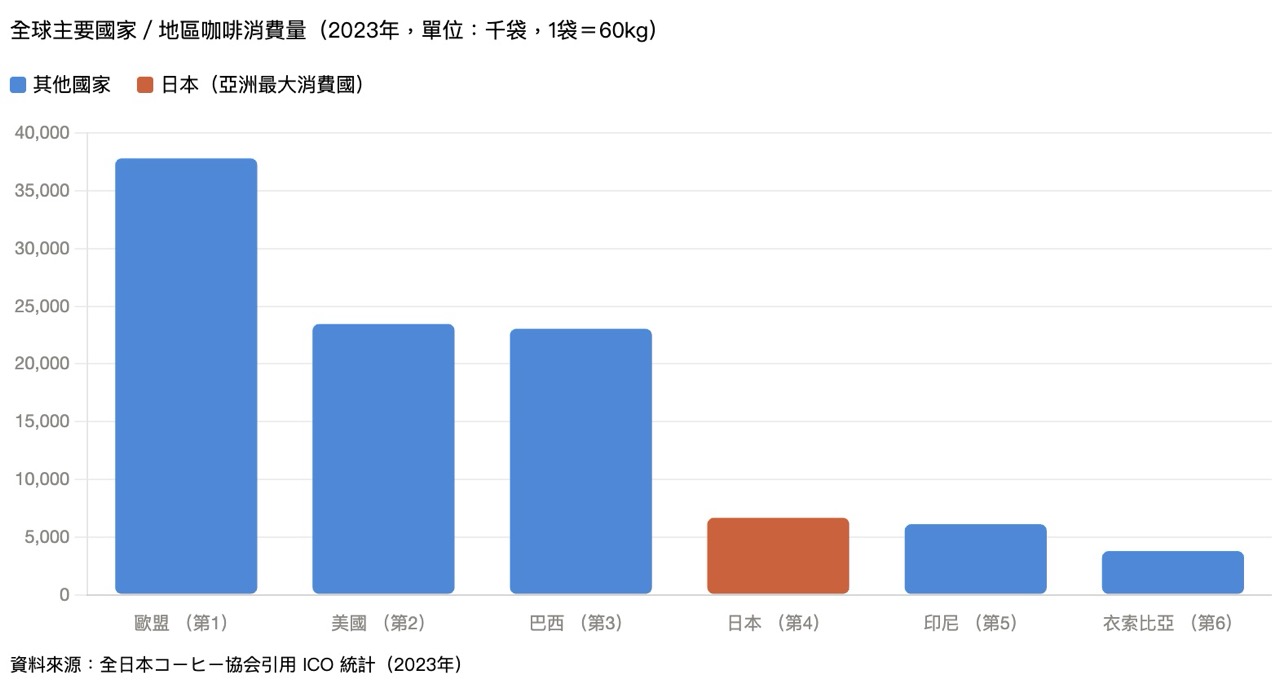 從全球視角來看,根據全日本咖啡協會引用國際咖啡組織(ICO:International Coffee Organization)的統計,日本 2023 年咖啡消費量在全球排名第 4,僅次於歐盟、美國與巴西,是亞洲最大的咖啡消費國。