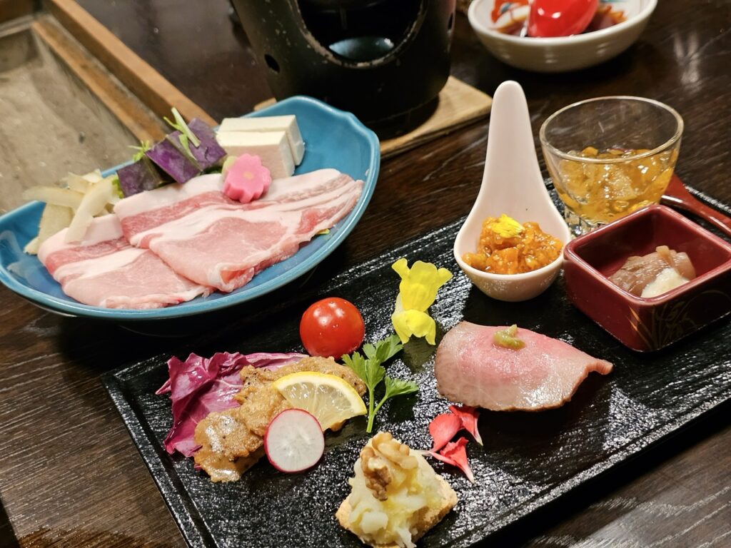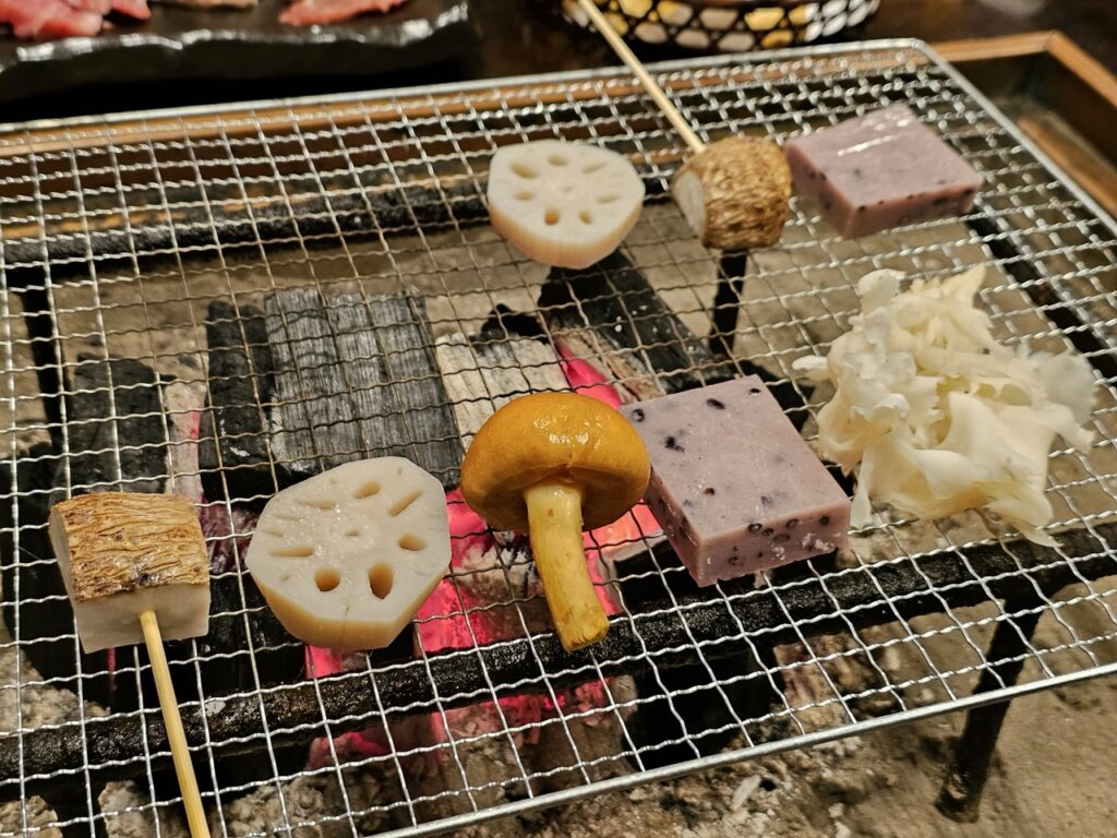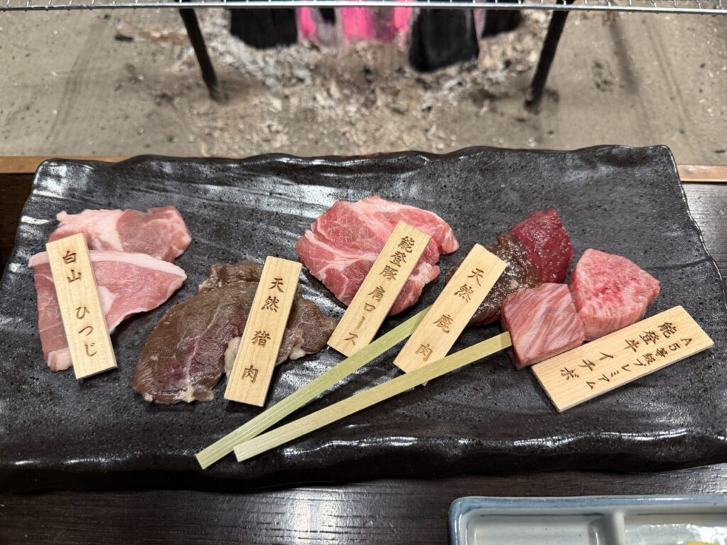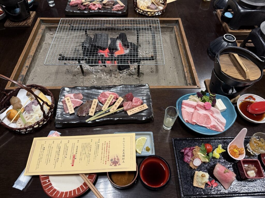 留宿的兩天一夜,我對館內提供的晚餐和早餐,留下深刻的印象。從燒烤能登牛、能登豬、白山羊肉到天然鹿肉,甚至還有台灣人很好奇的熊肉,也滿足了喜愛品嚐比較肉品的饕客。當然,當季的甘美蔬菜,也是餐桌上沒有缺席的角色。當地當旬的食材,在爐庵的用心挑選下,把白山的特色濃縮進舉箸之間。