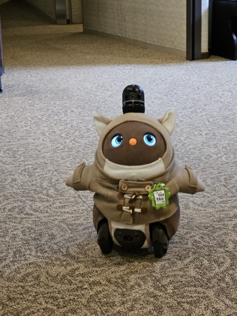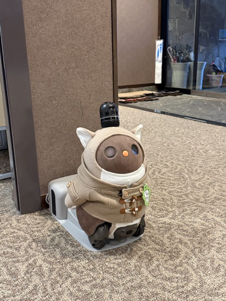 這是山﨑社長特別斥資買下來的陪伴型機器人,透過感測器可偵測觸碰,會做出情感反應與簡單對話。雖然無法真的取代人類做什麼實際上的事務,但就像一隻可愛的迎賓犬或看板貓似的存在,讓人看了心情極好。作為療癒型的接待角色,這隻機器人也成為了爐庵的亮點,受到外國旅客的喜愛。幾個住宿的外國小孩,退房離開與它告別時,顯得離情依依。