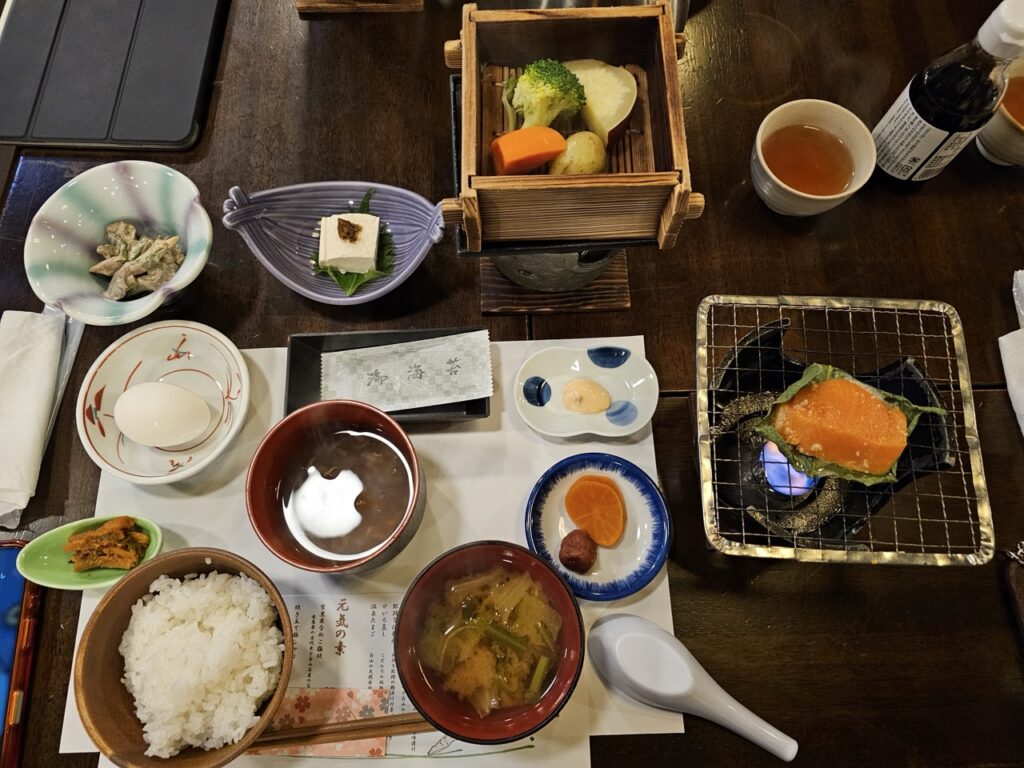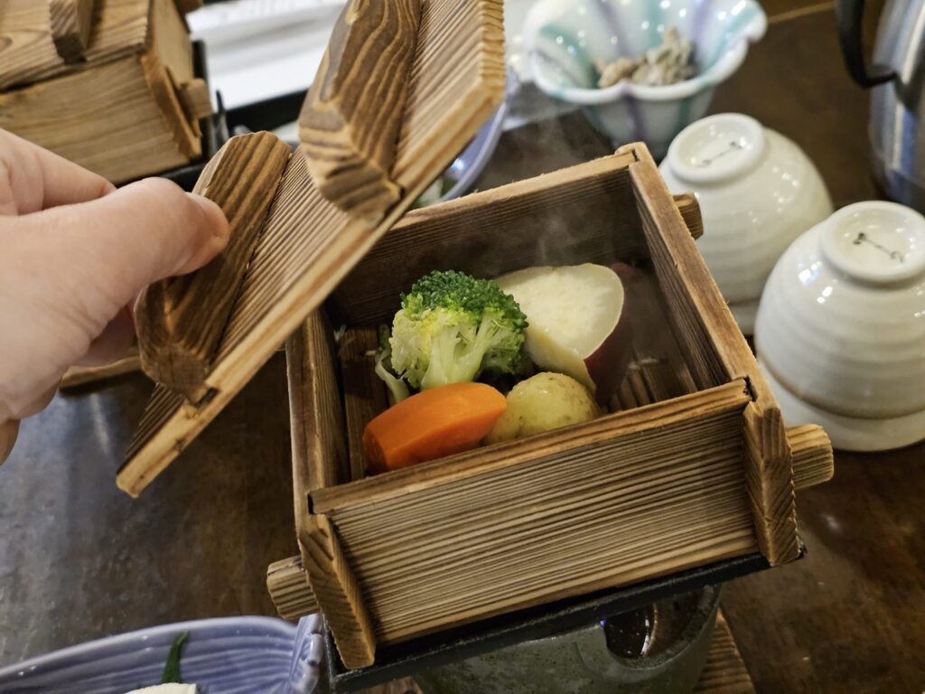 面對溫泉暫時斷絕的處境,山﨑社長重新把重心放回料理與住宿體驗本身。原本就頗受好評的餐飲,開始更積極與地方連結,不再透過市場統一進貨,而是直接向在地農家採購。契機來自一位從事有機、無農藥耕作的農夫,山﨑社長親自品嘗後,深感食材風味確實不同,也因此一步步走進農業。如今他自己也投入稻作與蔬菜種植,採行不使用除草劑、農藥,甚至不施肥的自然栽培方式。
