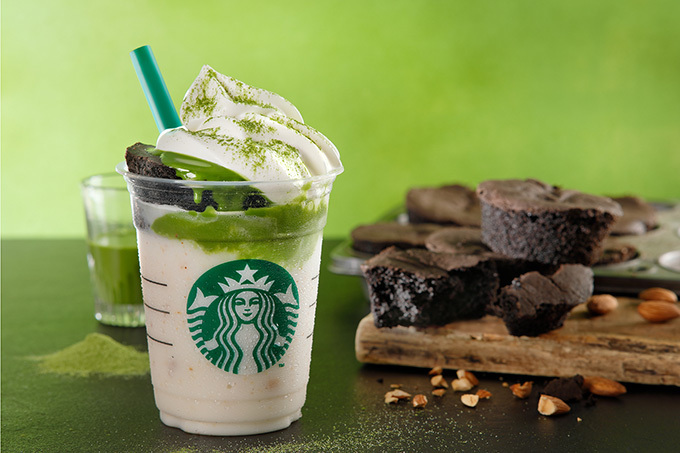 建議在飲用時將擔任主角的巧克力蛋糕戳碎均勻拌入星冰樂,同時享受杏仁的酥脆口感及抹茶醬的香濃風味。