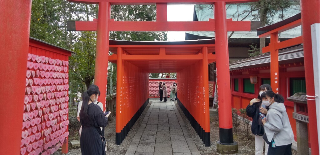 稻荷神社特有的紅色鳥居旁掛滿了粉紅愛心繪馬