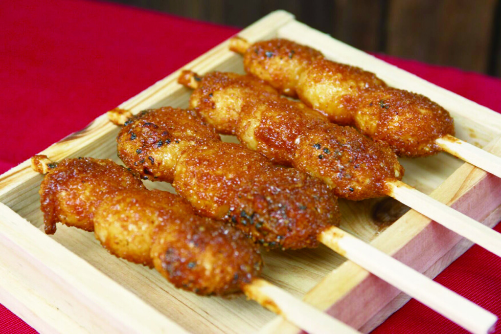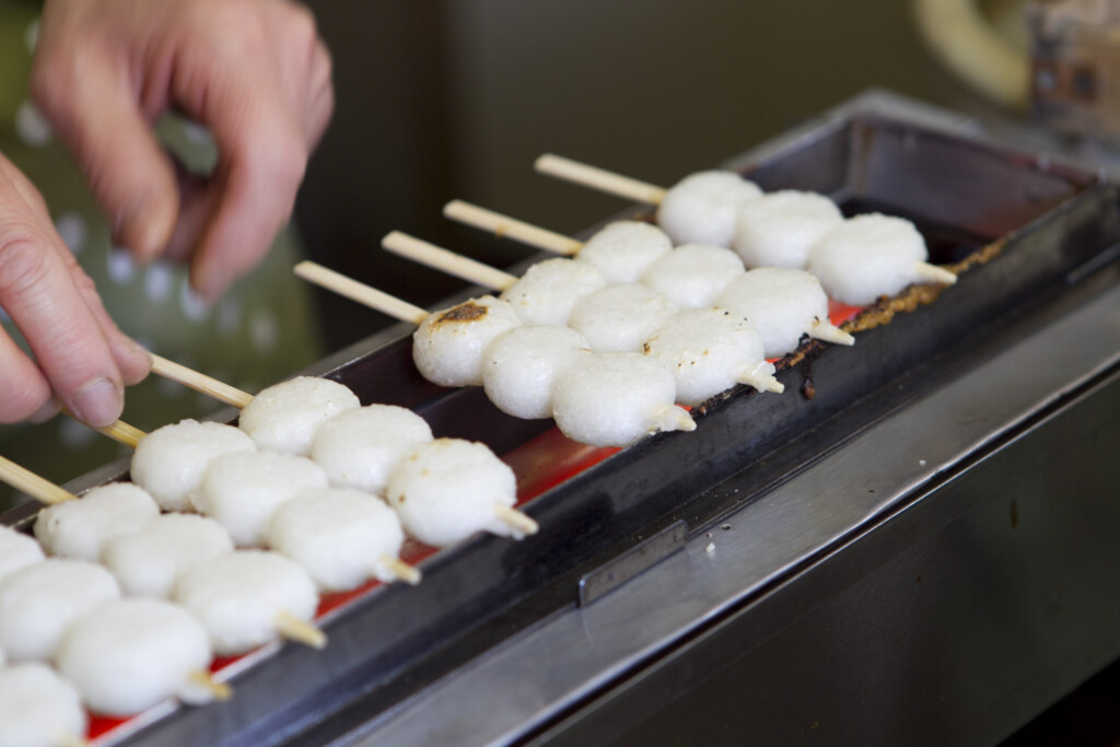 五平餅是把粳米飯搗碎做成串,塗上醬汁燒烤的中部地方鄉土料理。