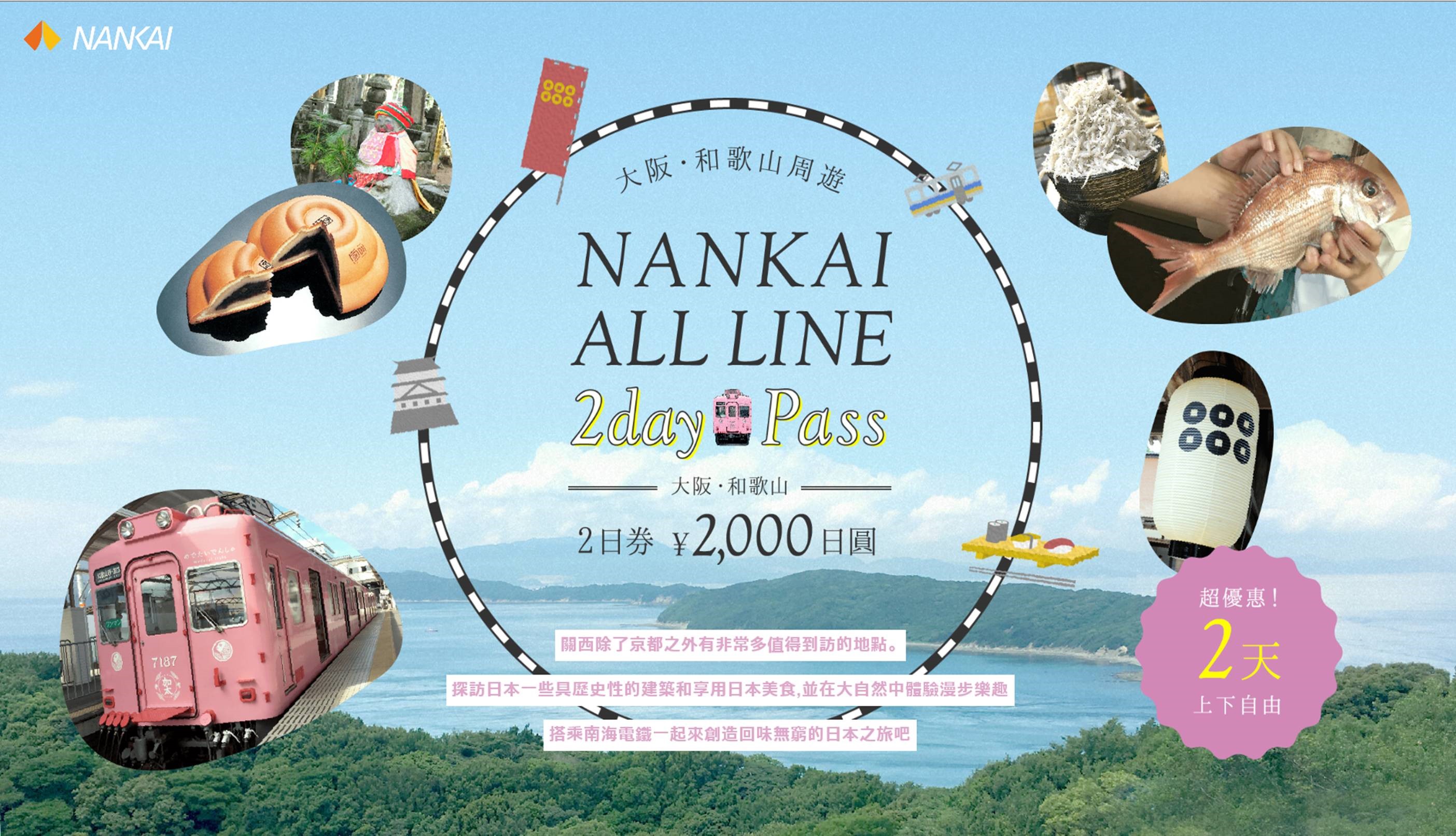 可以前往大阪難波等地的「NANKAI ALL LINE 2day Pass」(南海電鐵的全線自由搭乘二日劵)能在兩天內無限次乘坐南海電鐵全線(泉北線除外),是專為外國旅客設計的超優惠交通套票。除了可以用來從關西機場到難波以外,還能盡享南海電鐵沿線的日本美食、溫泉、世界遺產、秋日紅葉與和服體驗。